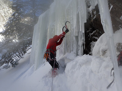 ツルツルの青氷で大変良く締まっており、アックスとアイゼンの効きは抜群でした。