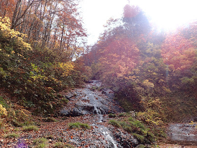 二口林道を進み、林道が右岸から左岸にわたる橋の直前にゲートがある。ゲートの手前に駐車スペースがあり、ここで身支度を整えて出発。橋を渡った先から入渓した。小松原沢を遡行し、山形神室岳と(仙台)神室岳間の尾根に出て、(仙台)神室岳頂上へ。そこから南沢を下降して元に戻った。小松原沢はナメがとても綺麗な沢だ。紅葉も素晴らしい!