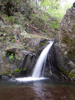 北秋川、藤倉から惣角沢沿いの林道を進み、林道が沢から離れるカーブのところから仕事道に入る。しばらくすると、雨乞いの滝が現れる。F1(雨乞いの滝)